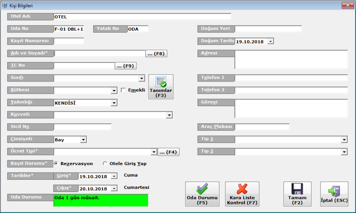 Otel modülü ile birden fazla otel / kat takibi yapılır. Kalanların ihtiyaç doğrultusundaki tüm bilgileri kayıt edilir. Oda raporları günlük, aylık ve yıllık alınır. Bunun yanında kara liste ile otele giriş yapacak personelin kontrolü sağlanır. Uzun süreli oda kullanımlarındaki ücret değişikliklerini eksiksiz takip eder. Beyanname hazırlar. Ek yatak ekleme özelliği de vardır.