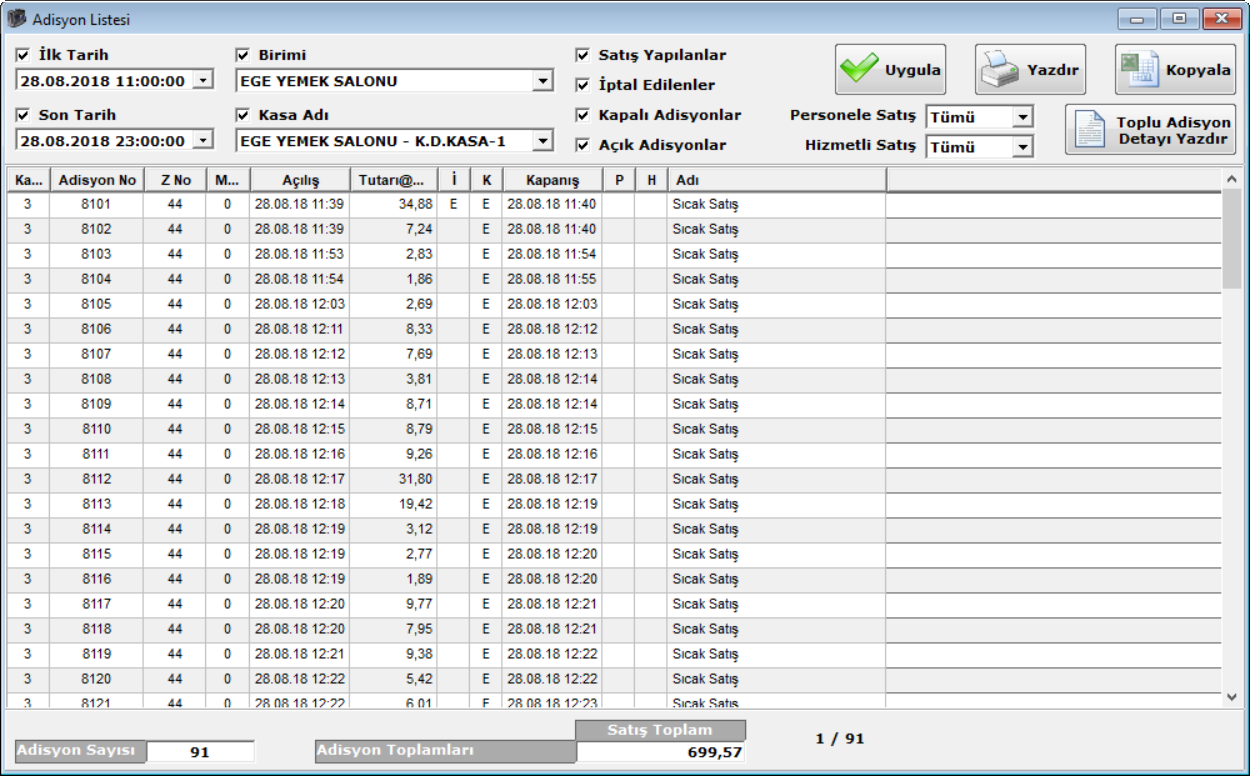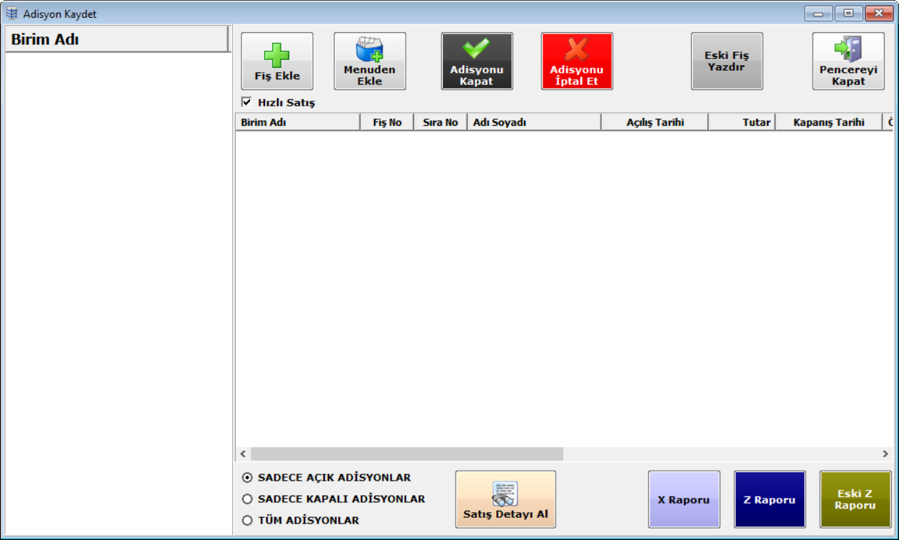 Adisyon programı, tesisin işletmelerinde masa / self servis / tabldot usülü satış yapmak için hazırlanmış modüldür. Kullanıcı, kurulum tipine göre aynı anda birden fazla adisyon açabilir ve bunları takip edebilir. Ayrıpersonel indirimi ve garson paylı satışı uygulayabilir. Gün sonunda alınması gereken tüm raporları detaylı olarak verir.