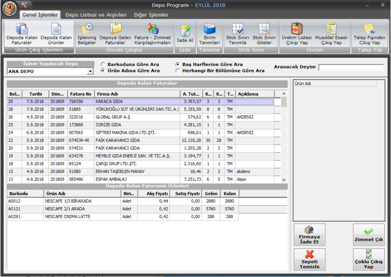 Depo Modülü; gerek Kantin başkanlığında Fiili Depo tutulsun gerekse Sanal Depo tutulsun, Ema Kantin programının kantinlere zimmet çıkmak amacıyla kullanılan modülüdür. Fatura girişinde kaydedilen ürünleri isteğe göre fatura bazında isteğe göre tek tek dağıtımını yapar. Ancak Depo görevlisi ürüne ait fiyatı ve faturada girilen adedi değiştiremez.