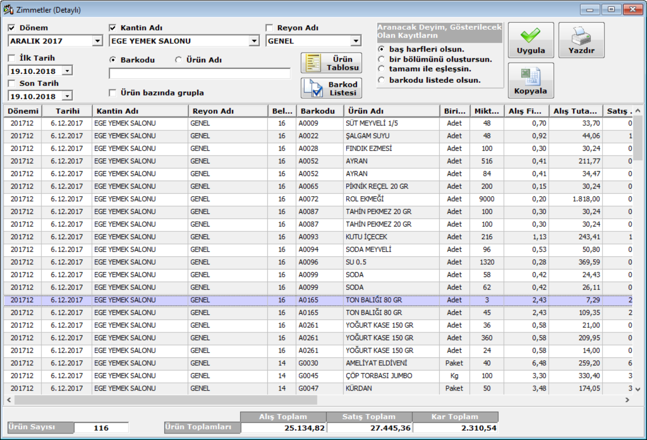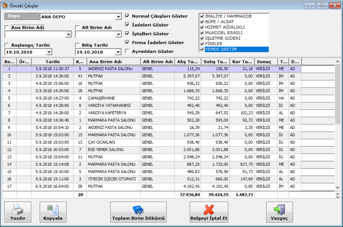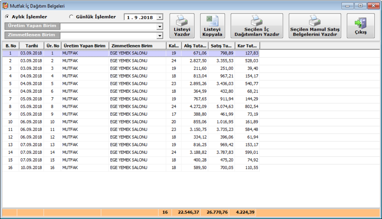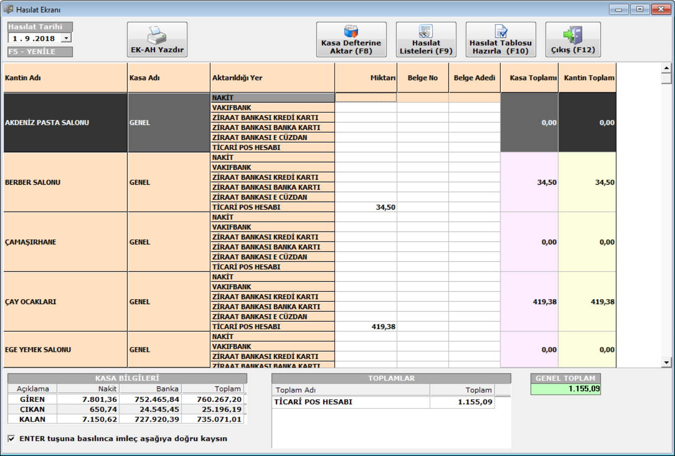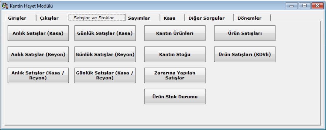 · Kantin/Reyon hasılatlarının kaydı ve özet dökümü yapılır,iki tarih aralığında istenen kantin/reyonun hasılat listeleri alınabilir.