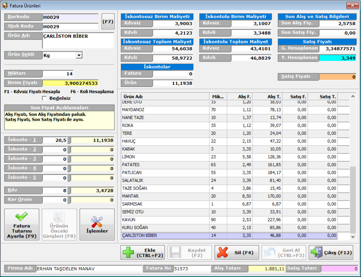 Fatura girişi modülü Ema kantin otomasyonunun temel taşıdır. Kantine gelen mal faturalarının ürün girişi, barkodsuz ürünlerin barkodlandırılması ve fiyatlandırma işlemi bu modülde yapılır. Fatura girişinde yapılan ürünlerin kaydından sonra faturanın fiyat tespit tutanağının otomatik olarak çıktısı alınabilir. Sistem tek kayıt esasına dayandığı için burada kaydedilen fatura kasa modülüne, depo modülüne ve muhasebe modülüne aktarılır. Burada yapılan kayıt diğer modüllerde değiştirilemez. Alımı yapılan ürüne ait mevcut fiyat, satılması gereken fiyat ve kar oranları ekranda yer aldığından kullanıcının hata yapma olasılığı azdır. Zararına bir fiyatlandırma yapıldığında kullanıcı uyarılır. Ayrıca ürüne ait geçmiş bilgiler de yer aldığından kantinin alımlarında hatasız bir ürün geçmiş bilgisini sunarak doğru fiyattan ve adet'ten alım yapılmasında kullanıcıya rehberlik eder. Dönemsel olma özelliği sayesinde içinde bulunulan ay haricinde de kapatılan ay bilgilerinin görülebilmesi imkanı vardır.