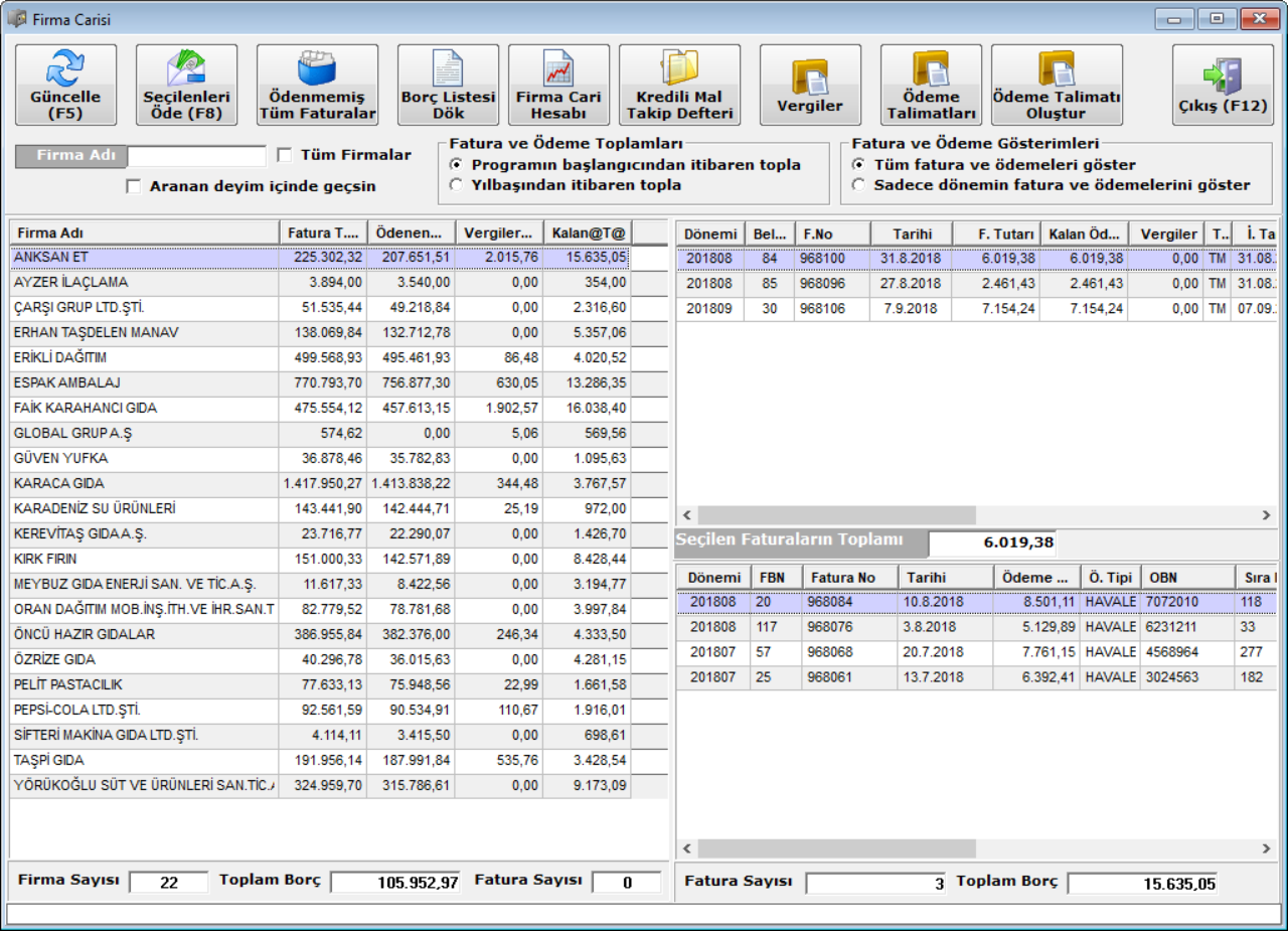 · Ödenmemiş faturaları takip eder, listelenir ve firma cari ekstresi dökülebilir.