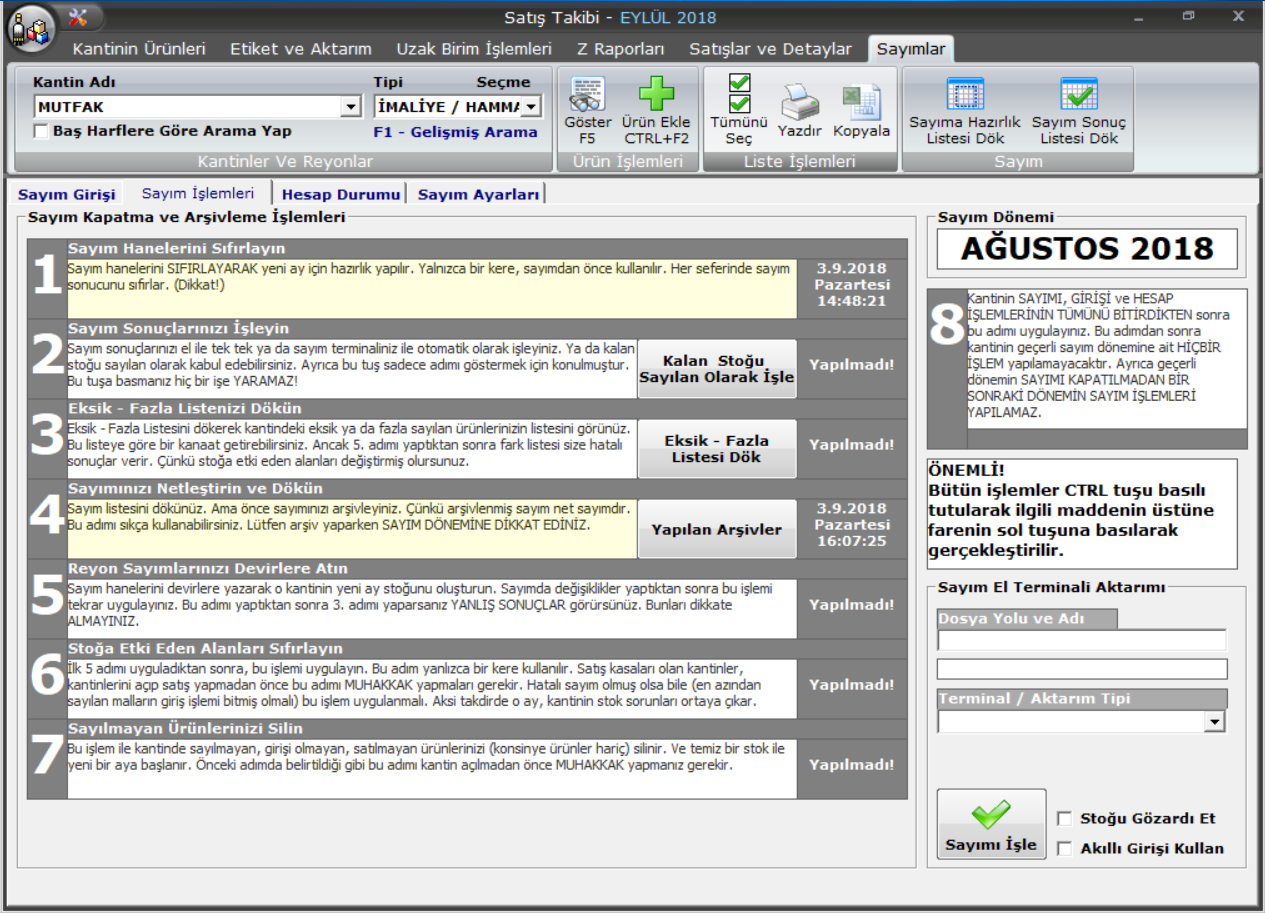 Online ve Offline kantin/reyonların mal giriş ve satış hareketlerini takip eder, mevcut stokları ve ürün hareketlerini gösterir. Sayım bölümü; hazırlık, giriş ve sonuç listeleri olmak üzere, eksik/fazla listesi ile beraber, ay sonu itibari ile sayım sonuçlarını verir.