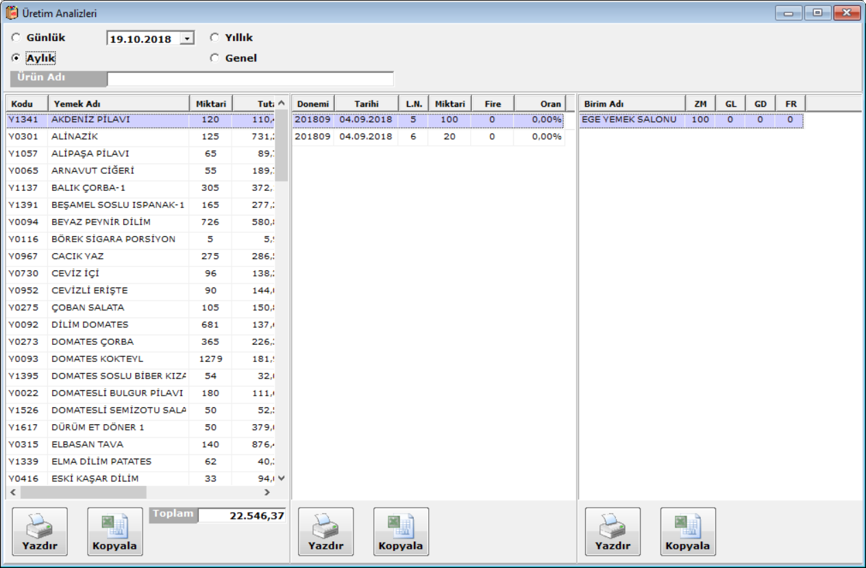 Üretim modülü ile muaddeler hazırlanır ve aylık planlamalar yapılarak günlük yemek listeleri hazırlanabilir. Gün sonunda ise lokanta cetvelleri sayesinde hasılat, fire, iade işlemleri yapılır. Ayrıca adisyon modülü için menüler hazırlanır.